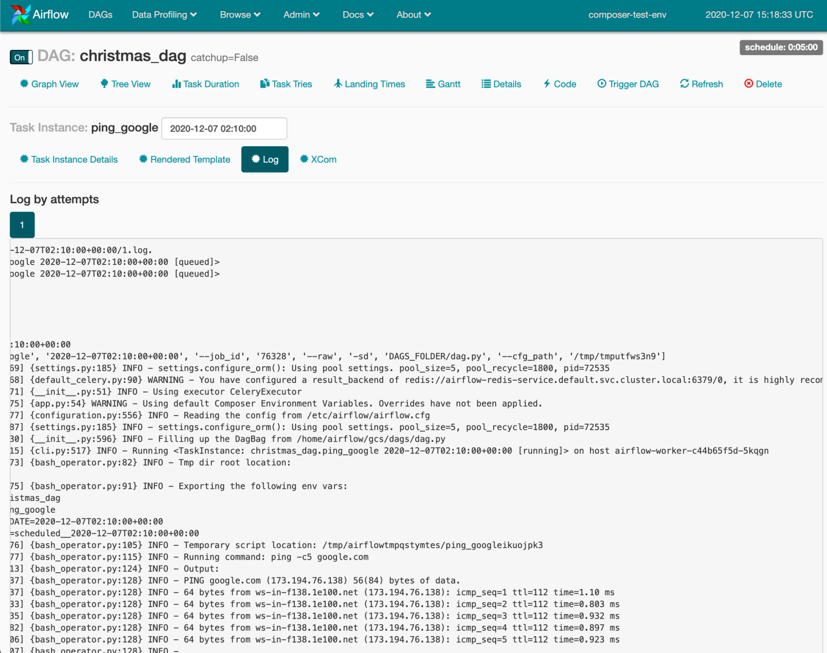 The task sent five pings to google, exactly what we expected it to do. The logs also include some information about the worker that ran the task.