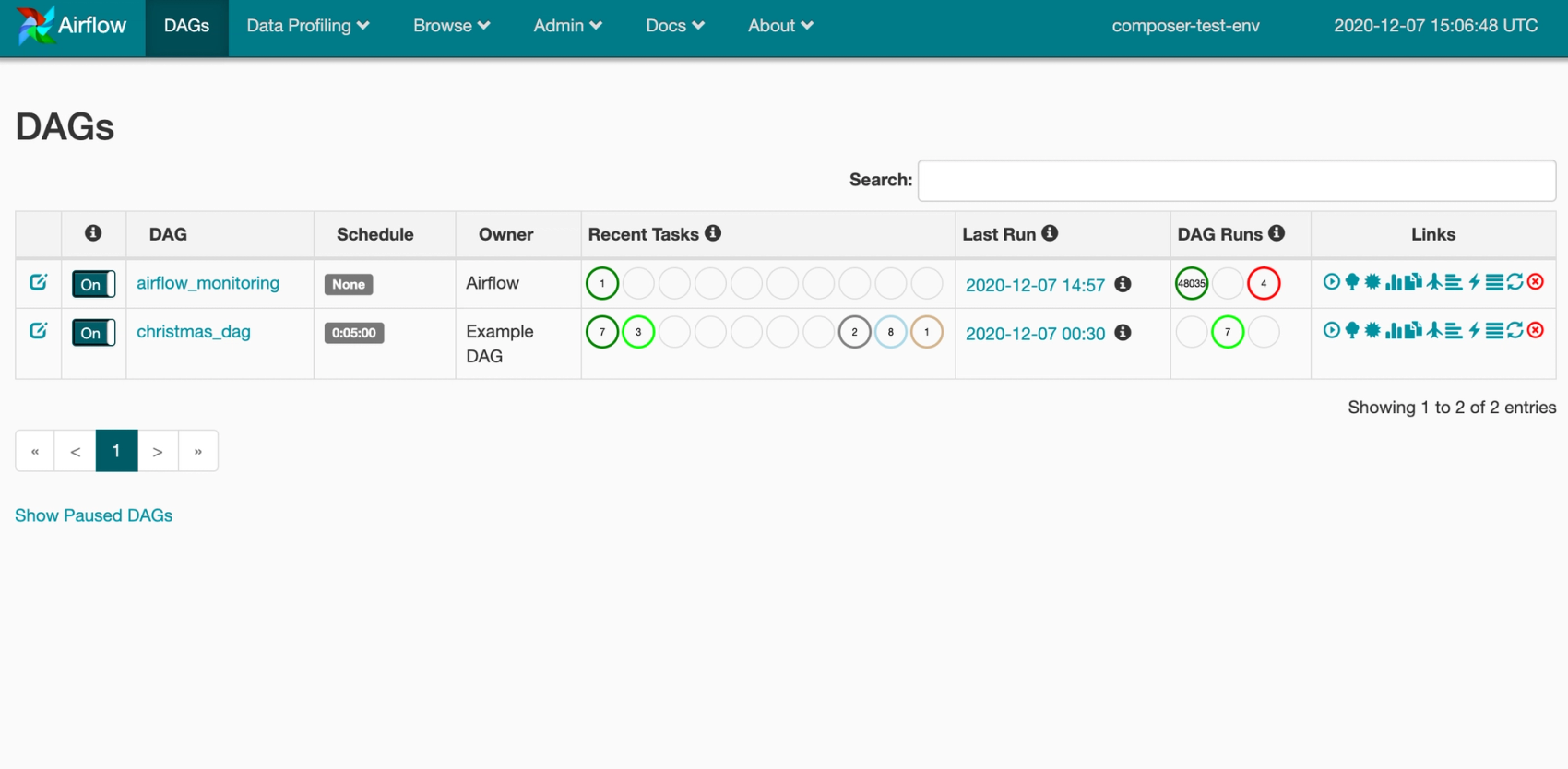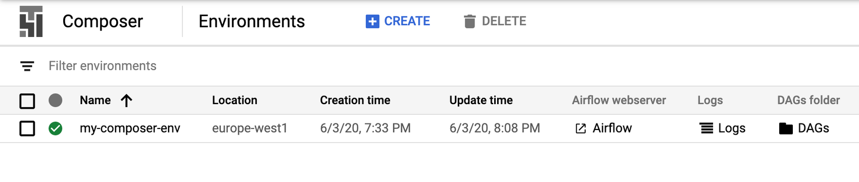 Once the environment is created, you can click the Airflow link to visit the Airflow web server. Here you can see all DAGs, previous runs and trigger new runs manually. By default, Cloud Composer includes an airflow_monitoring DAG to monitor that the environment is working. The web server is protected by Google IAP, so only authorised users can access it.