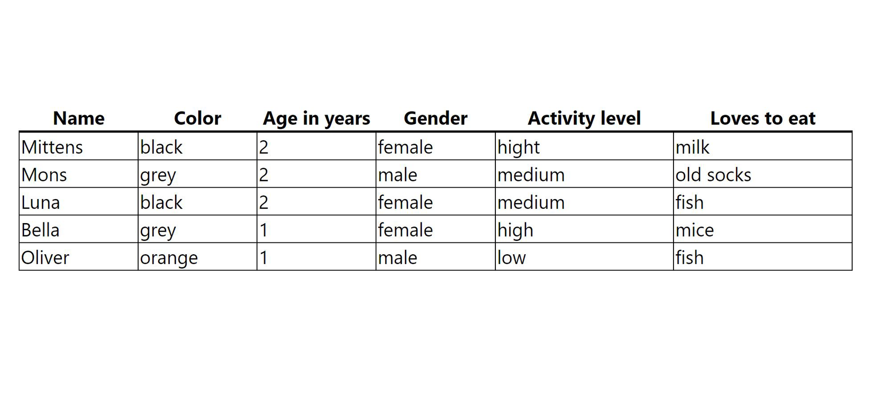 I will be using a data set of cats.🐱 The cat objects will look like this: