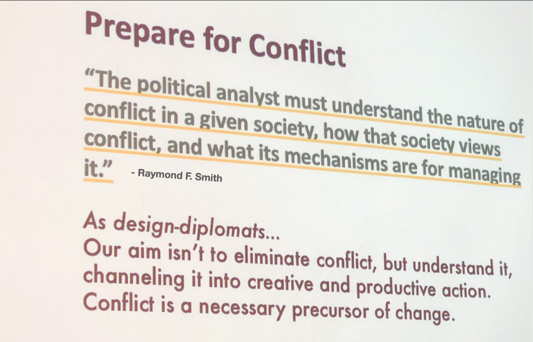 As design diplomats... Our aim isn't to eliminate conflict, but understand it, channeling it into creative and productive action. Conflict is a necessary precursor of change.