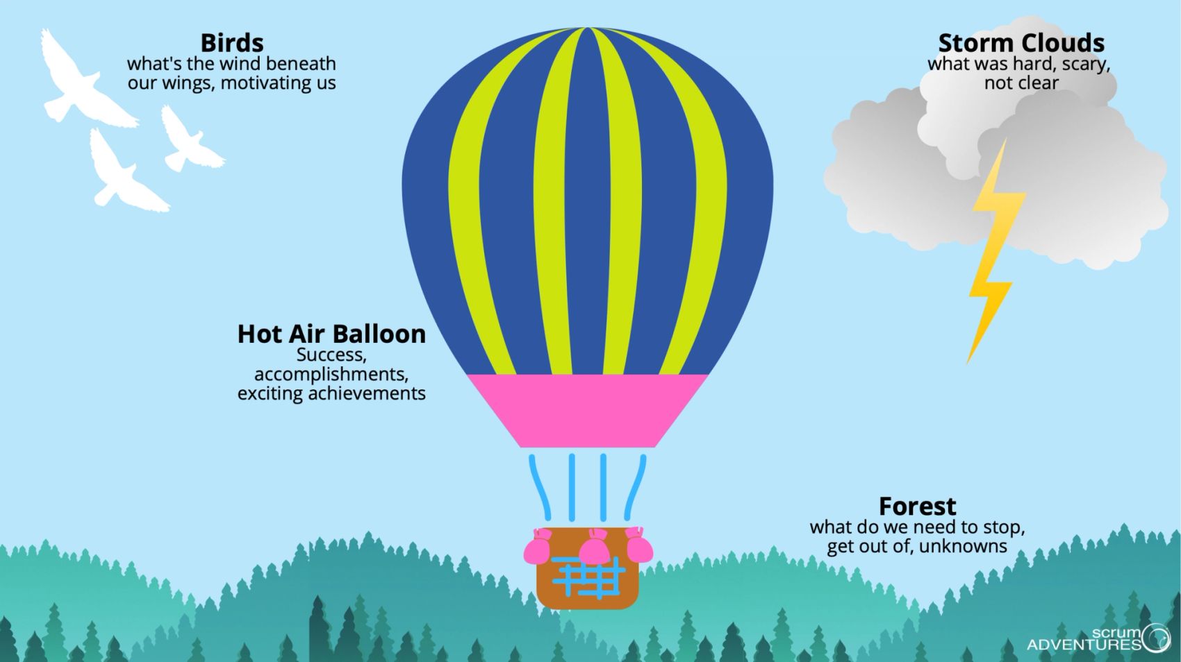 Bli med på en luftetur i luftballongen! På denne reisen får man reflektert over faktorer som støtter eller hemmer teamets fremgang i prosjektet og muligheten til å identifisere forbedringsområder. Man får også hevet blikket sitt og spotte eventuelle risikoer som skimtes i horisonten.