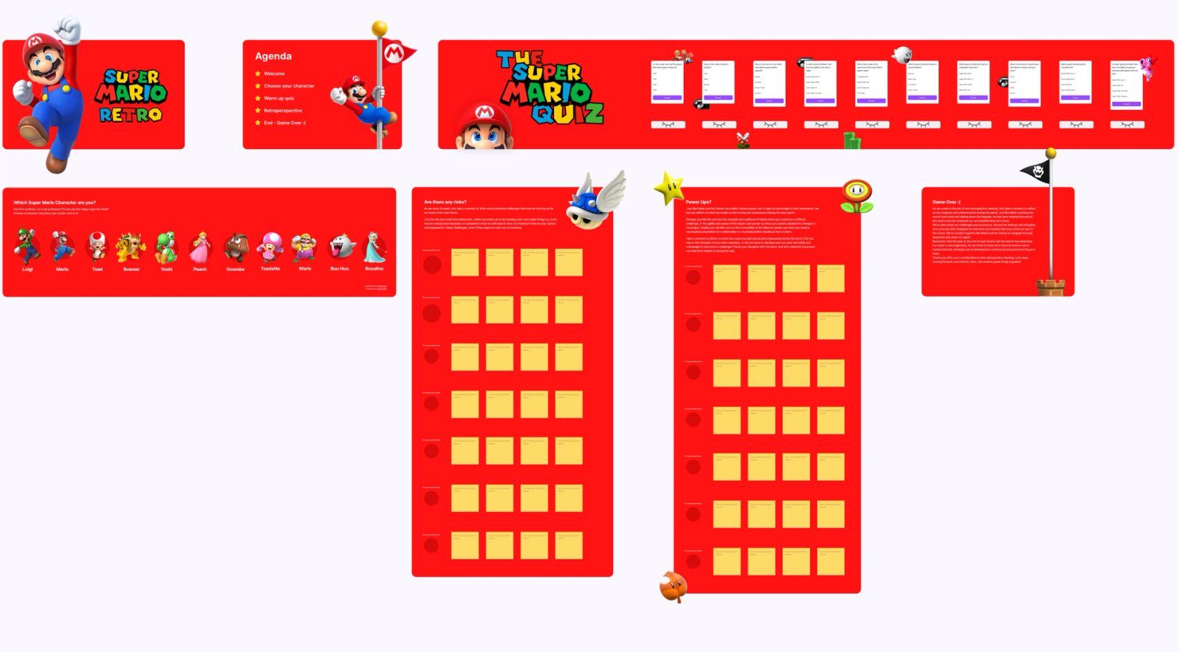 Velg først en karakter hver fra Mario-universet, og kickstart det hele med en quiz om Mario (10 minutter). Quizen letter på stemningen før man går videre til selve retroen. Retroen består av to seksjoner: risikoer og utfordringer (blått skall) og styrker (Power ups). I begge seksjonene skal man først reflektere individuelt over om noen blå skall kan ta dere igjen eller ulike Power-Ups man har i teamet. Deretter går man gjennom lappene i plenum. Bruk ca. 10 minutter per seksjon. Bestem til slutt tiltak dere vil gjennomføre for å minske kraften de blå skallene kan ha på teamet. Om dette var uklart står det beskrevet stegvis i retro-malen.