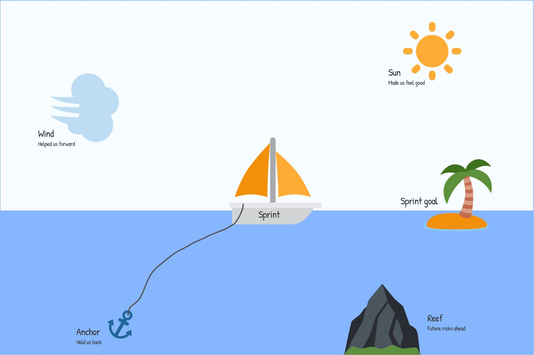 Kjører man denne fysisk er det bare å tegne opp seilbåten på en tavle. Gjerne en utvikler. Eller en som “påstår de ikke kan tegne” - det bringer ofte med seg litt humor og løsner stemningen før en retro. Digitalt? Benytt malen i retrobanken.