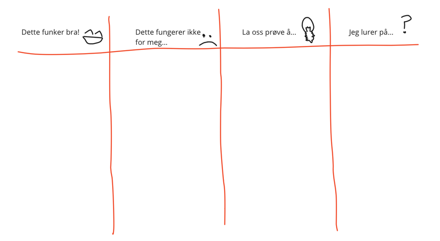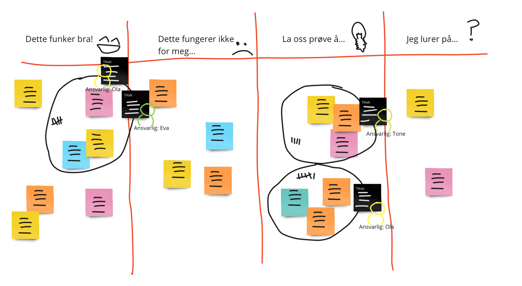 - Bli enige om konkrete oppfølgingstiltak for temaene som ble stemt fram. Diskutér og bli enige om forbedringstiltak. Tiltakene trenger ikke være det som står på lappene fra før. Terskelen for å teste noe bør være lav – det er uansett bare for de neste 2-3 ukene. Det er mye bedre å prøve noe, enn å ende opp med å ikke gjøre noen ting. Det har en egen verdi å trene endringsmuskelen!