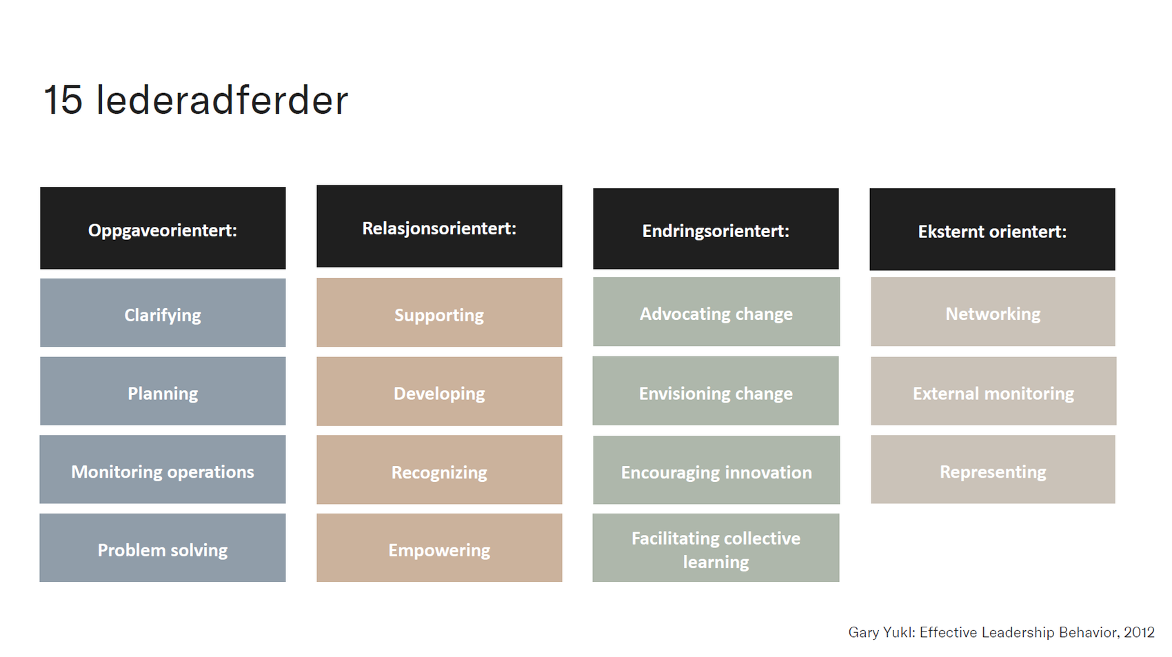 Oppgaveorientert adferd, relasjonsorientert, endringsorientert og adferd knyttet til ekstern orientering.
