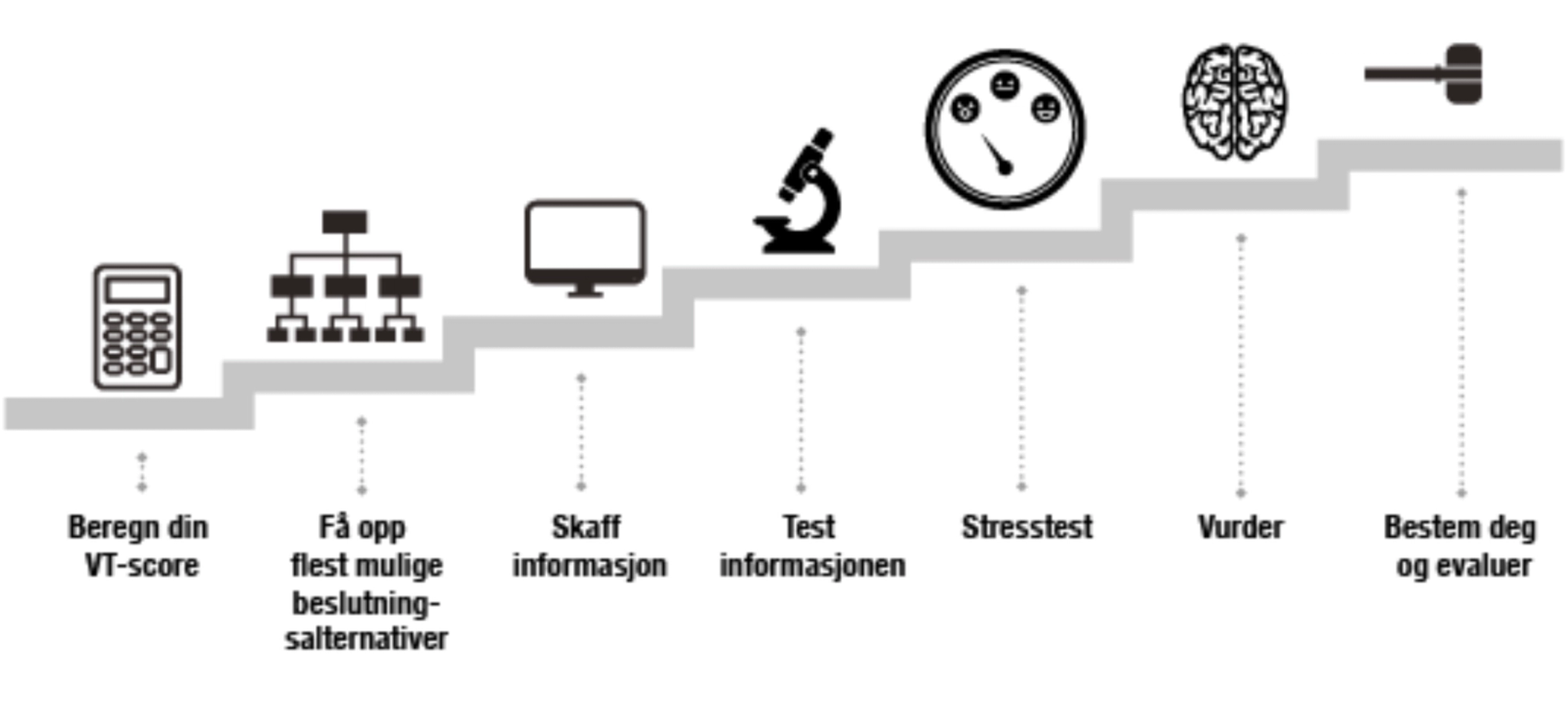 Introduserer beslutningstrappa! Eller egentlig ei god bok skrevet av Jan-Ole Hesselberg og Reidunnn Lognvik Reinholdt som heter «Bedre beslutninger». I boka beskriver de nettopp en metode for å ta bedre beslutninger. Den trenger ikke ta lang tid, men inneholder elementer som er nyttige å ta med i prosessen for å sikre at beslutningen tas på bakgrunn av det du vet, ikke hva du tror.