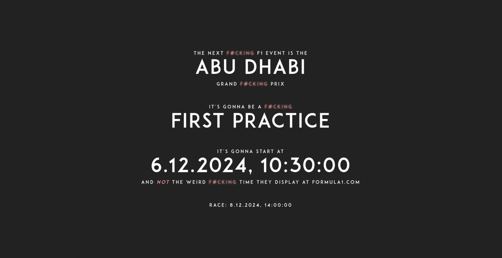 Whenisthefuckingrace.com er en enkel nettside som viser tidspunktet for neste F1-event, enten det er trening, kvalifisering, sprint eller løp. Hensikten er å formidle denne informasjonen på en mest mulig konsis og direkte måte. Nettsiden er inspirert av gullklumpen "Just fucking google it" (eller eventuelt "Let me GPT that for you" hvis du er født i en nyere generasjon) som formidler informasjon til brukeren på en litt passiv-aggressiv måte. Whenisthefuckingrace er derimot ikke irritert på brukeren, men heller på den offisielle nettsiden til F1, www.formula1.com. Kall det brukerfeil, men jeg har nemlig alltid slitt med å finne tiden for neste F1-løp på den offisielle siden. Flere ganger i 2021 åpnet jeg F1 TV for å se et F1-løp, bare for å oppdage at løpet var ferdig for over tre timer siden, og bli møtt av en thumbnail som avslørte at Hamilton hadde vunnet og Latifi krasjet i første sving. Grunnen til dette var at jeg sleit med å navigere det offisielle F1-nettstedet for å finne tiden for neste løp.