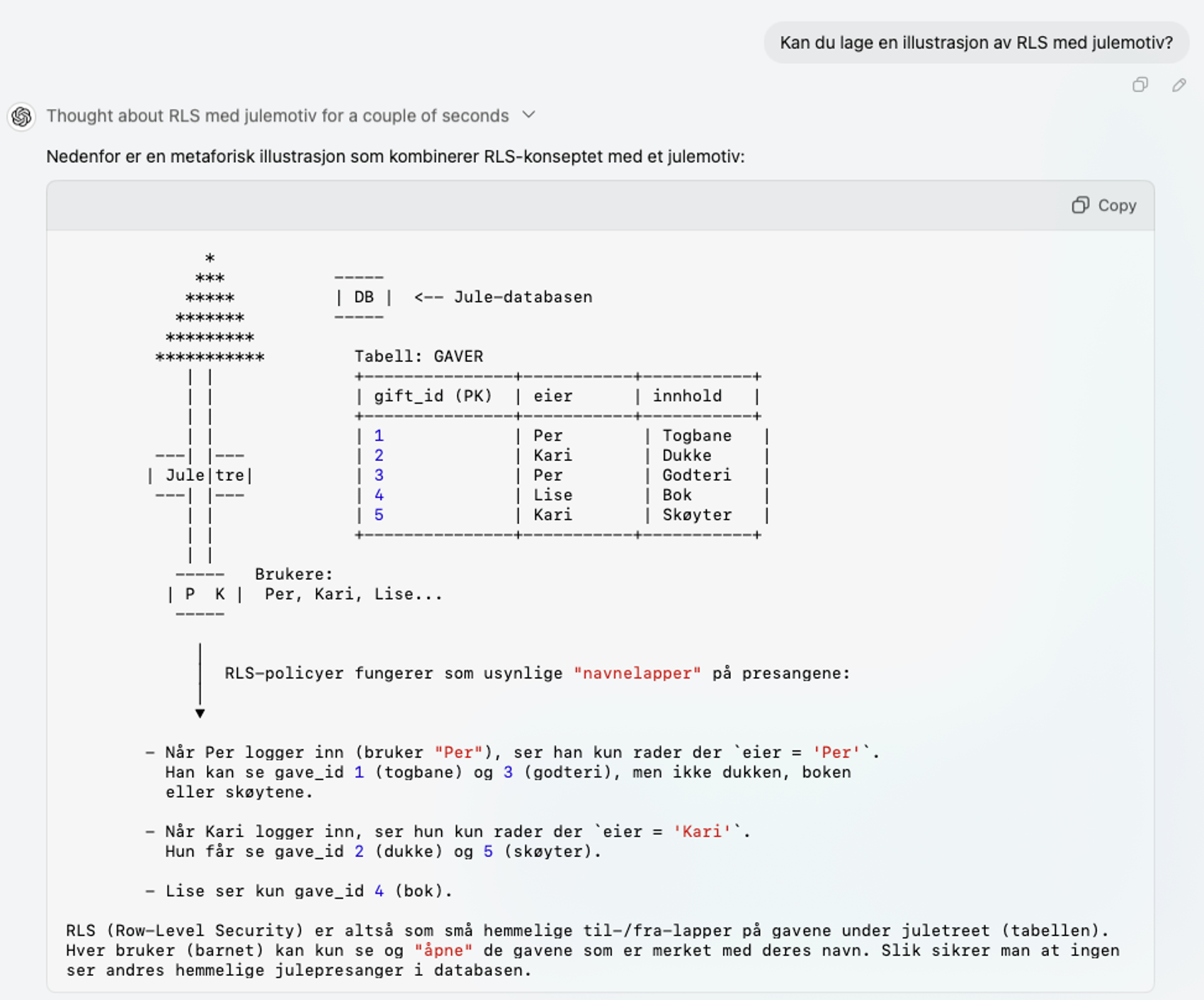 Jeg tenkte å bruke ChatGPT til å lage et stilig forsidebilde til denne artikkelen, men jeg fikk istedenfor en fin julemetafor som forklarer RLS på en enkel måte: