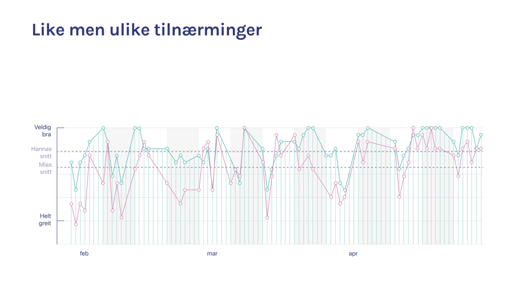 Vi oppdaget også personlige forskjeller. Mias gjennomsnittlige score var lavere enn min, men dette reflekterte ikke nødvendigvis en dårligere dag. I stedet viste det seg at vi hadde forskjellige skalaer for hvordan vi evaluerte prestasjonene våre. Motivasjon og kreativitet er ofte subjektive og må sees i lys av personlige opplevelser.