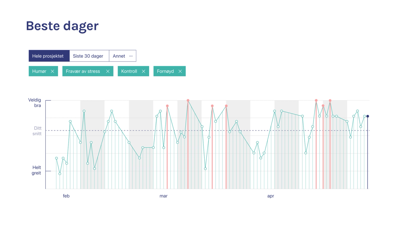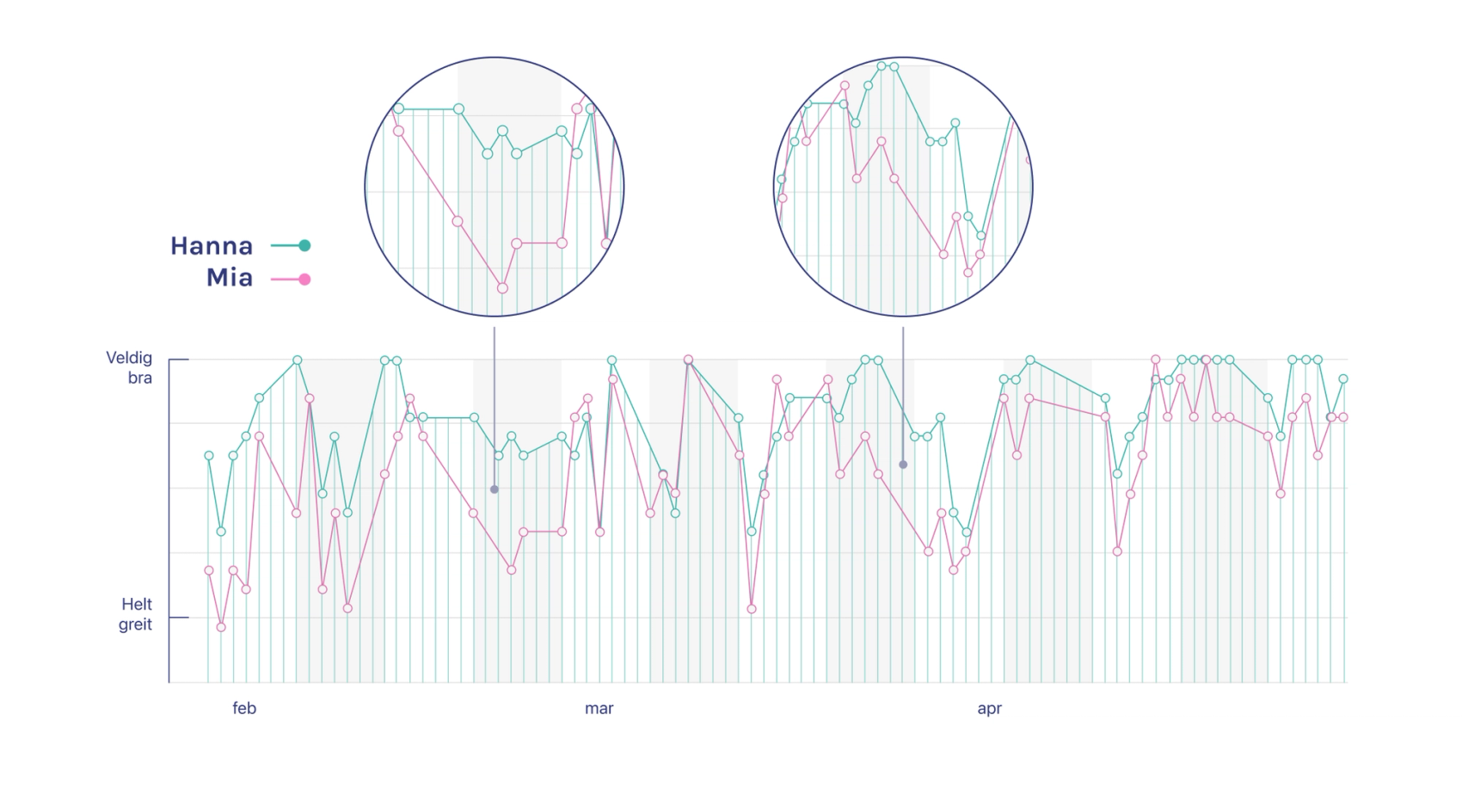 Vi oppdaget to avvik i grafene våre, som dagboknotatene avslørte skyldtes sykdom og personlige utfordringer. Slike hindringer påvirket prestasjonen, og det var viktig for oss å ha et miljø med høy takhøyde og forståelse for dette.