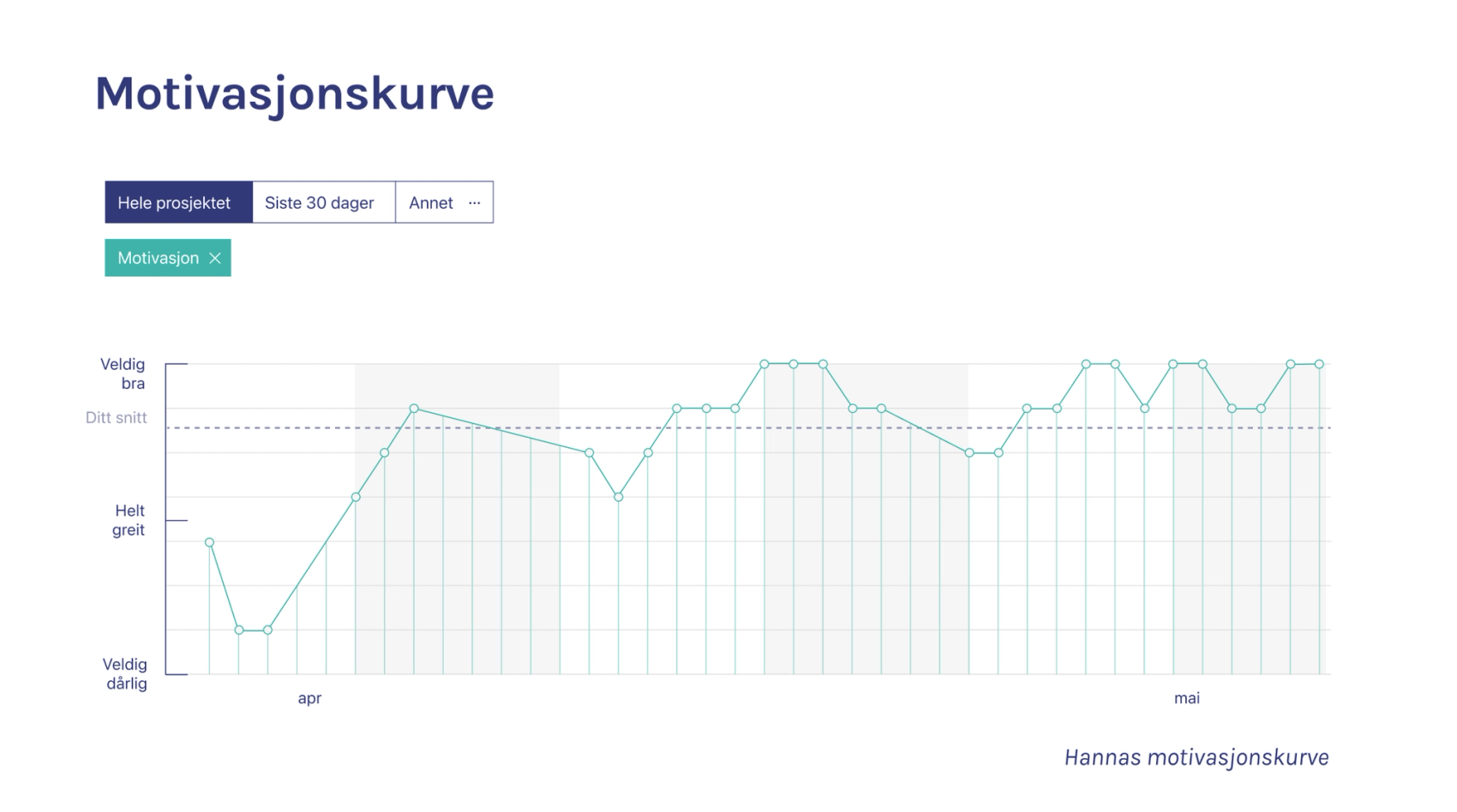 Motivasjonengrafen vår startet på et lavt nivå, men steg gradvis etter hvert som vi ble mer bevisste på hvordan vi kunne påvirke vår egen motivasjon.