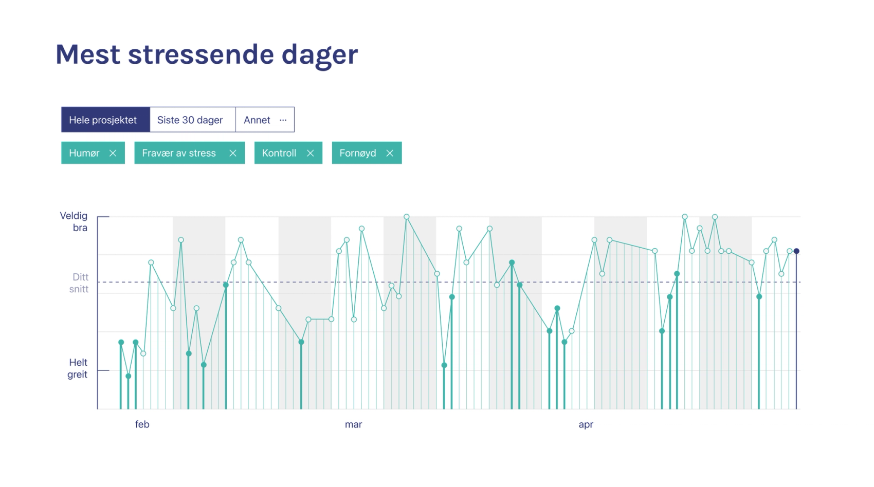 Vi dokumenterte relativt lite stress gjennom prosjektet, men når vi opplevde stress, var det ofte knyttet til usikkerhet rundt prosjektets retning eller kommende deadlines.