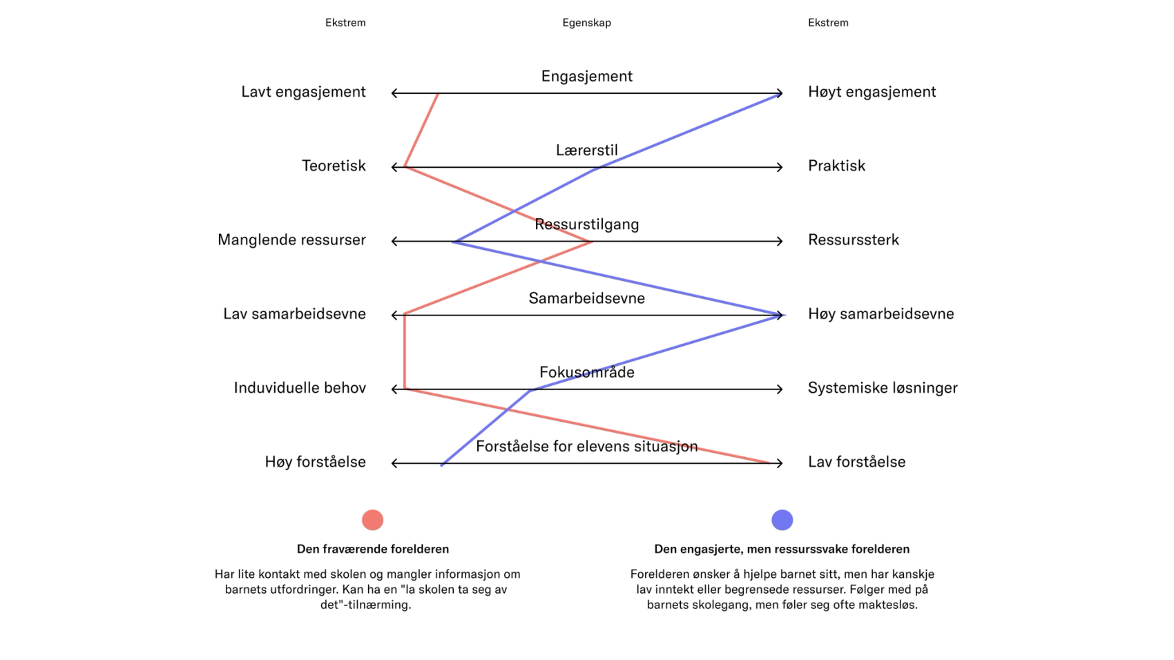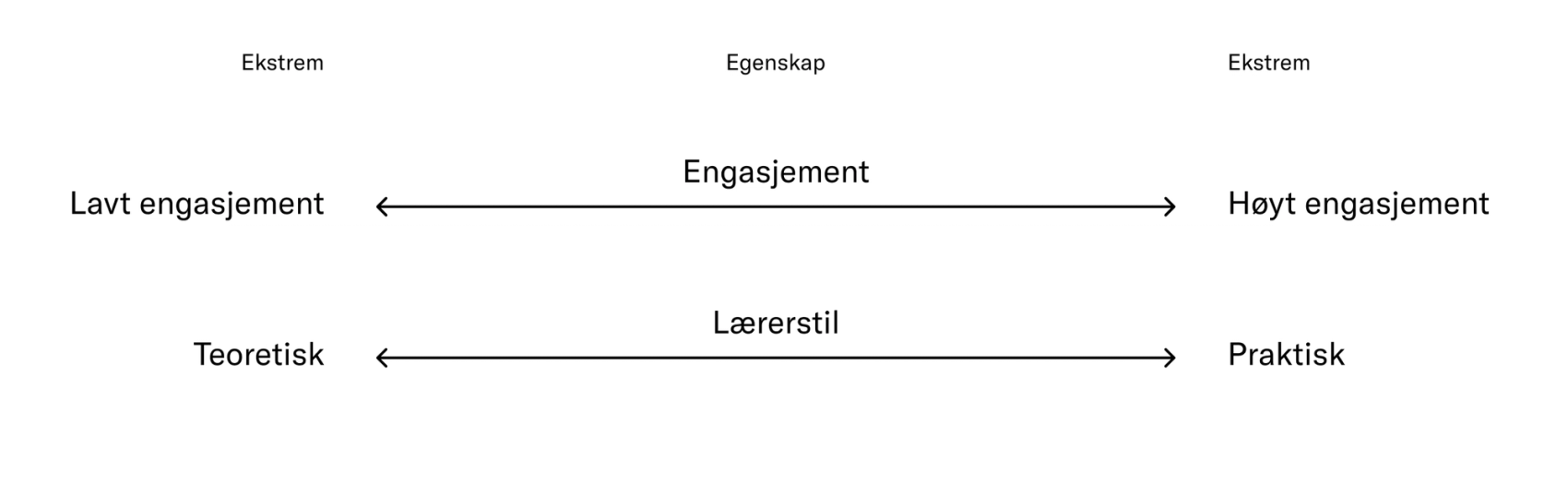 - Skriv hver egenskap i midten, og definer ekstremer av den på hver av sidene. f.eks. lavt engasjement vs høyt engasjement.