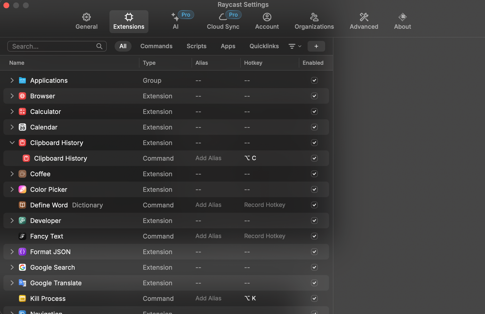 Når du har lastet ned de forskjellige utvidelsene, kan du gå inn i innstillingene til Raycast og legge til en hotkey for den gitte utvidelsen slik at du kan nå den med et (strengt talt to) tastetrykk.
