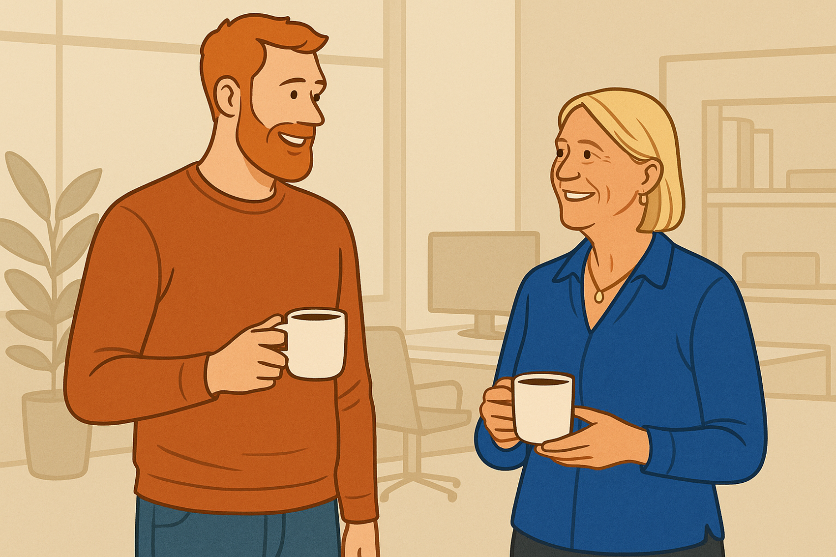 Det er fredag morgen. Vi to, Ole Kristian og Kjersti, velger ofte kontoret på fredager. Det er kjøtt og kake i kantina til lunsj, og det er alltid fint å avslutte uken sammen. Kanskje også med en TimeGuessr hvis vi får tid. Vi setter oss ned på plassene ved siden av hverandre i landskapet med hver vår kaffekopp.